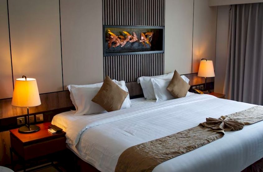 • A stylish hotel room features a large bed, bedside tables with lamps, and wall decor, creating a cozy and inviting atmosphere.