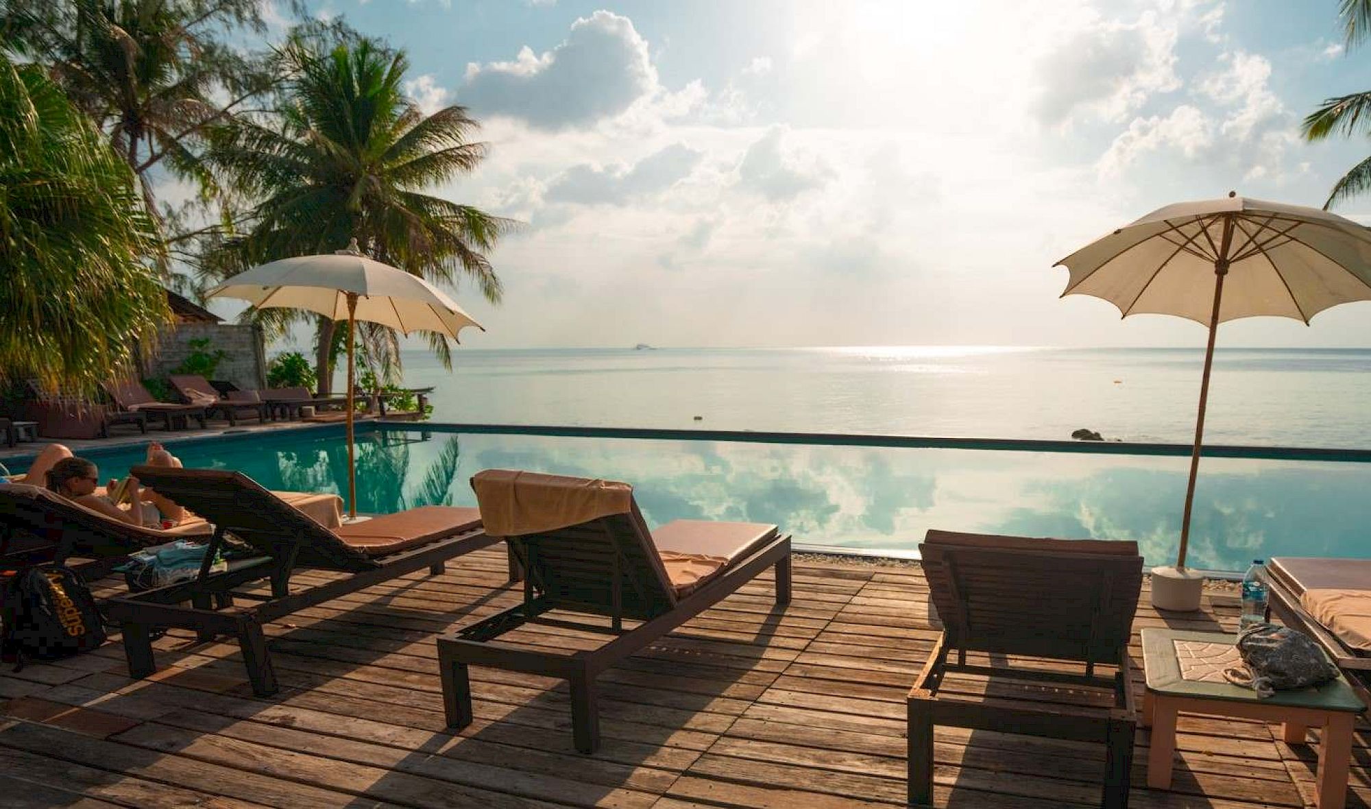 A serene poolside scene with lounge chairs, umbrellas, and palm trees, overlooking calm water under a partly cloudy sky.