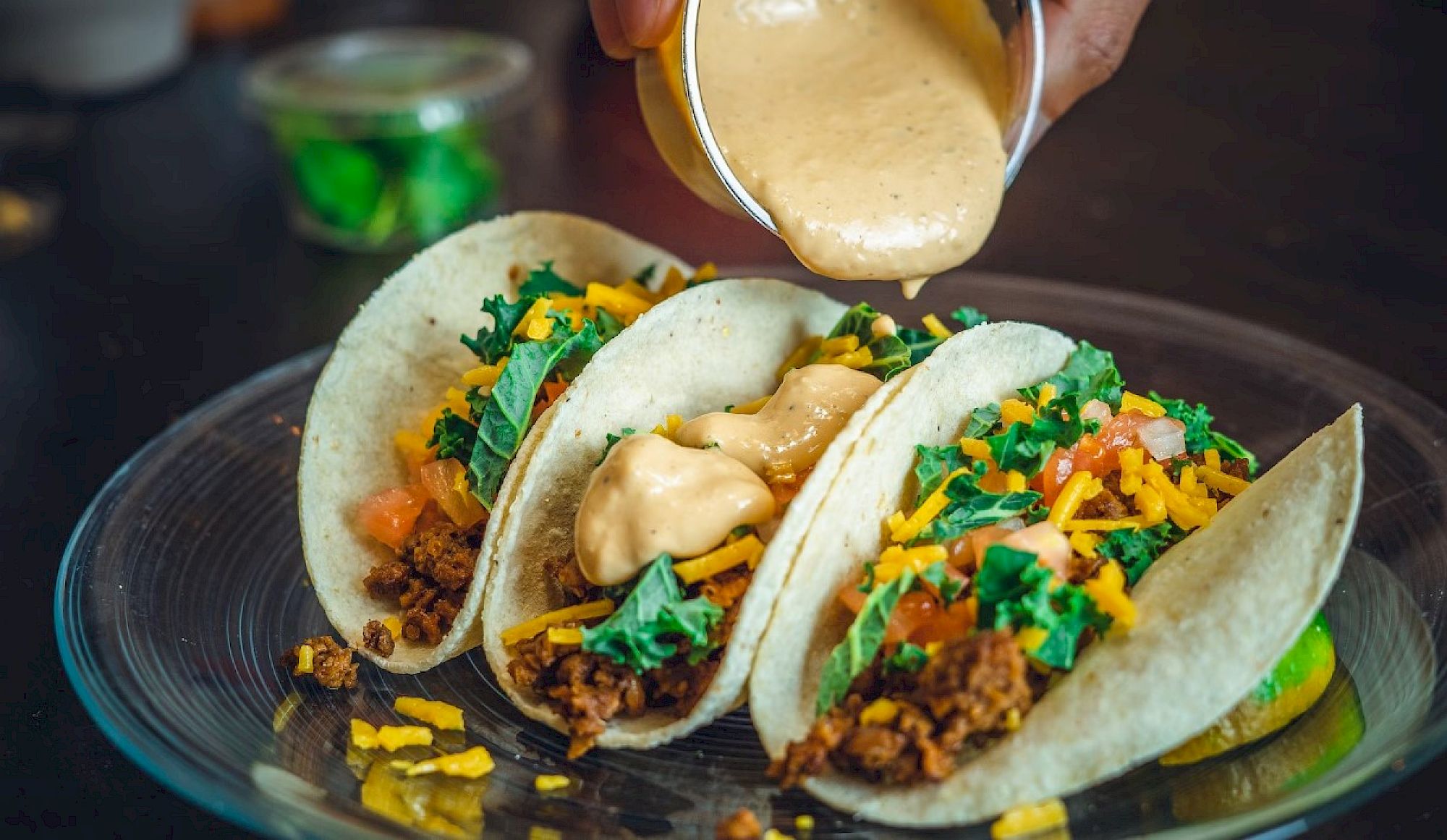 Three tacos filled with meat, cheese, lettuce, and tomatoes, with sauce being poured on top, presented on a glass plate.