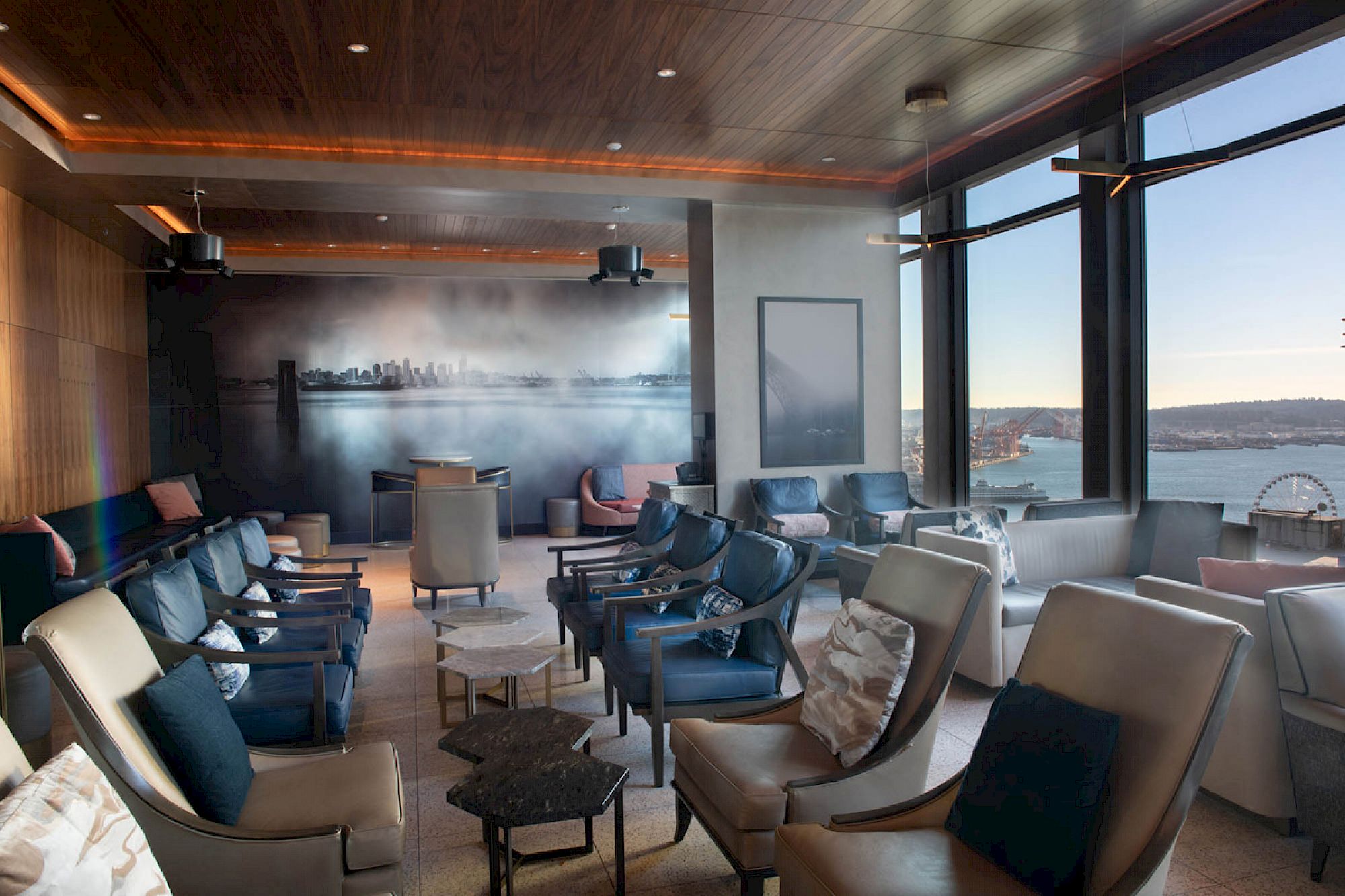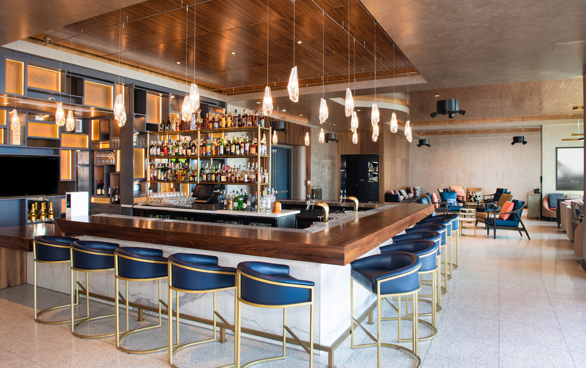 A modern bar with a wooden counter, blue stools, pendant lights, and a well-stocked liquor display, set in a spacious, stylish interior.