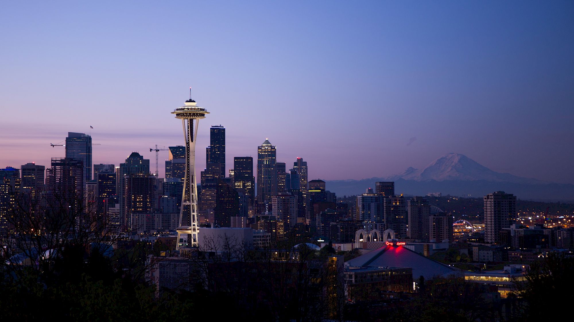 A twilight scene of Seattle with the Space Needle and Mount Rainier in the background, showcasing the city's skyline and evening ambiance.